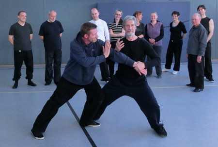 Wichtige Partner-Übung für das "Rooting" und somit auch für Push-Hands-Training geeignet: "Verwurzelung beim "Schattenboxen": Demonstration Dr. Langhoff und Meister Yang Zhenduo in Schweden.