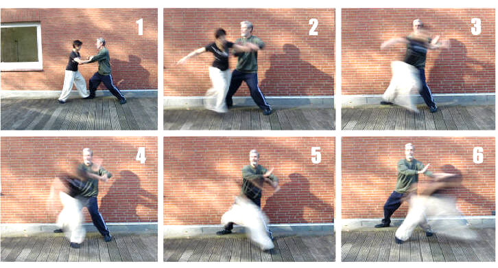 Schon 1969, als ich anfing, östliche Kampfkunst zu studieren, und "Kakie", die japanische Form des Push Hands kennen lernte, war ich besonders beeindruckt von den Techniken mit zwei zugleich angreifenden Kontrahenten und der Strategie des Yin Yang, daraus Vorteile zu ziehen. Man muss dabei nicht nur zentriert sein sondern auch so stabil wie der Boden, auf dem man steht und zugleich beweglich kreisen können - auch bei den Push-Hands-Prinzipien geht es um die "Meisterschaft der Kreise"! Dies wurde mir besonders deutlich beim Tuishou-Unterricht mit Meister Fu Zhongwen und seinem Sohn Fu Shengyuan. Konkret bemüht sich der Übende, eine für ihn ungünstige Situation in eine vorteilhafte umzuwandeln. Das ist "Kampfkunst pur" (vgl. die Lebensphilosophie einer meiner Lehrer Teruo Kono).